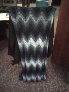 Like I’ve said, I just love variegated yarn. The gradual changes in color are what makes this piece really neat, not really the pattern. And the yarn does it as if by magic. I could not have planned the width of these ripples and how often the color changed to make the color pattern here.