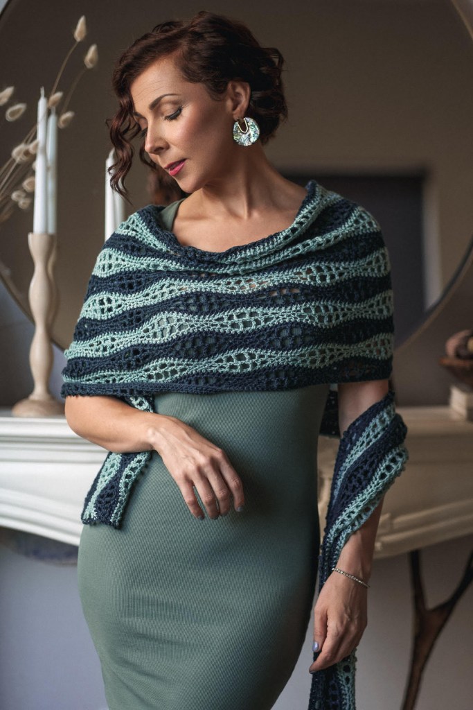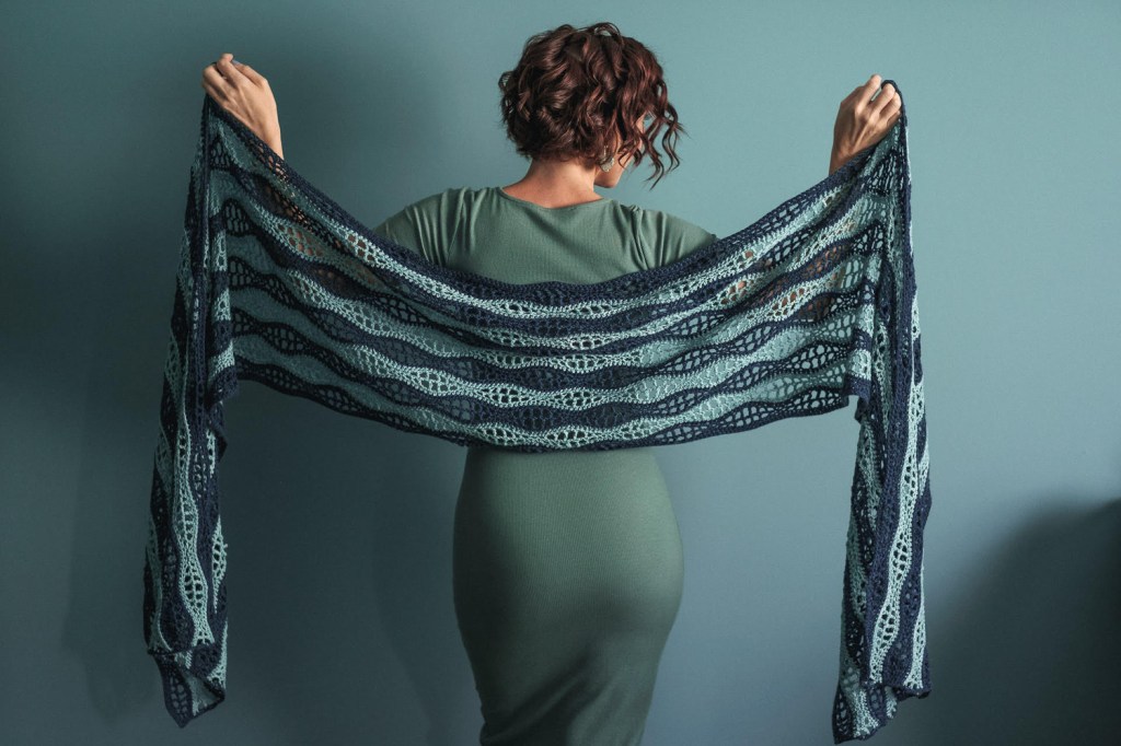 For this design, I selected Expression Fiber Arts’ luxurious Moongleam Fingering yarn, a harmonious blend of 50% cotton and 50% mulberry silk. This 2-ply yarn boasts a soft, silky texture with a subtle sheen, making it ideal for showcasing the intricate lacework of “Dantelina.” The sample features the “Lens Flare” colorway, a gorgeous smoky teal blue that adds depth and elegance to the piece. To recreate the shawl, you’ll need approximately 800 yards (732 meters) of fingering-weight yarn. With a wide range of stunning colorways available in their Moongleam Fingering collection, you can choose the perfect shade to make this shawl uniquely yours