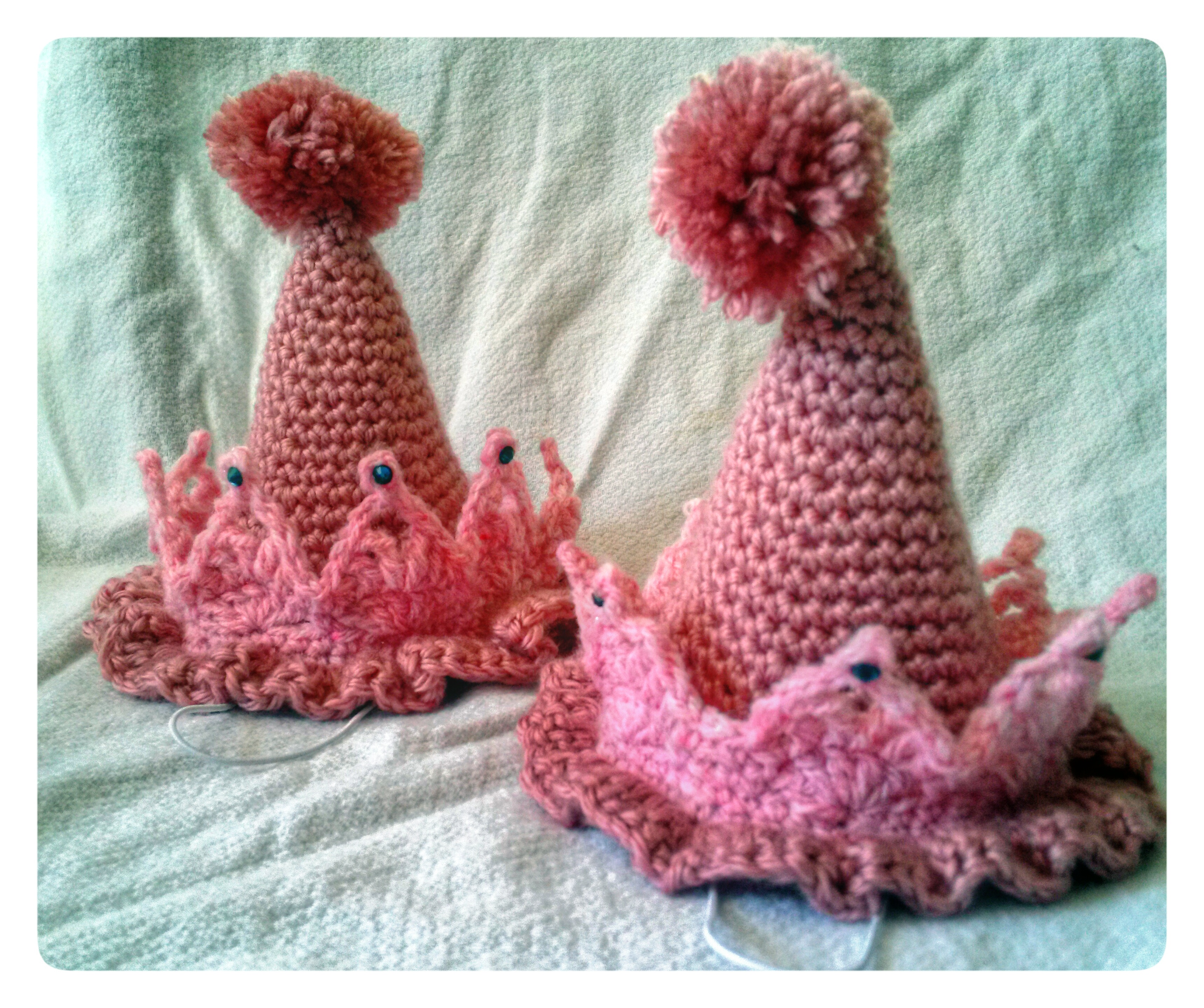 I made these cute little party hats for a friend of mine’s twin girls’ first birthday party. The pattern for the hats can be found here. I added the crown myself.