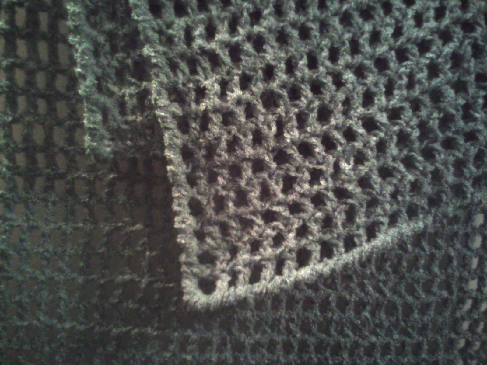 Being the middle of summer I wanted to design something that could be used to keep warm in the air conditioning, but still be delicate and light to match the time of year.  This yarn is very light weight and would work perfect for that.  I combined it with the very simple, open lattice-work stitching which is just double crochets and chains, and it turned out very nicely.