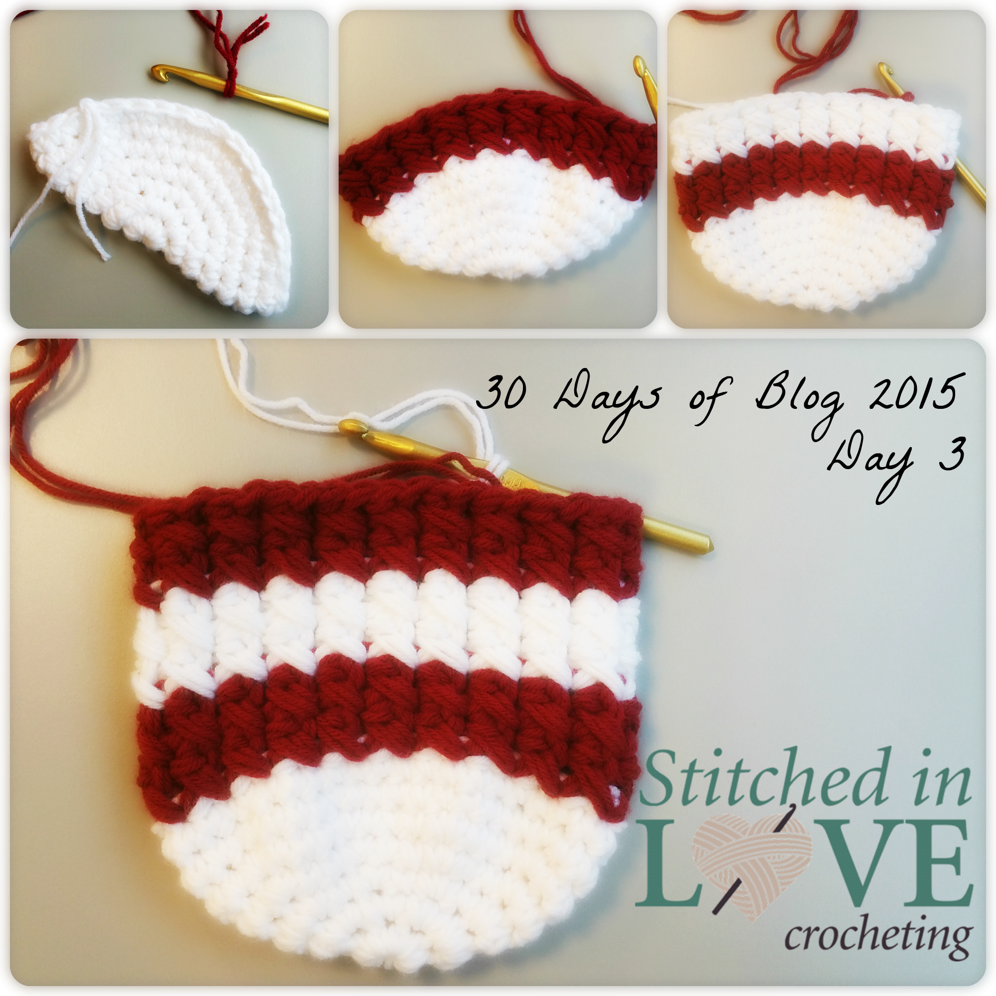 Day 2I am making my daughter’s stocking first with red and white candy cane stripes. I was able to work up the toe section in about 15 minutes and am anxious to see how big these will turn out.  I only had a few minutes to work on this today.  Tomorrow I should have more time so hopefully I can get more done.