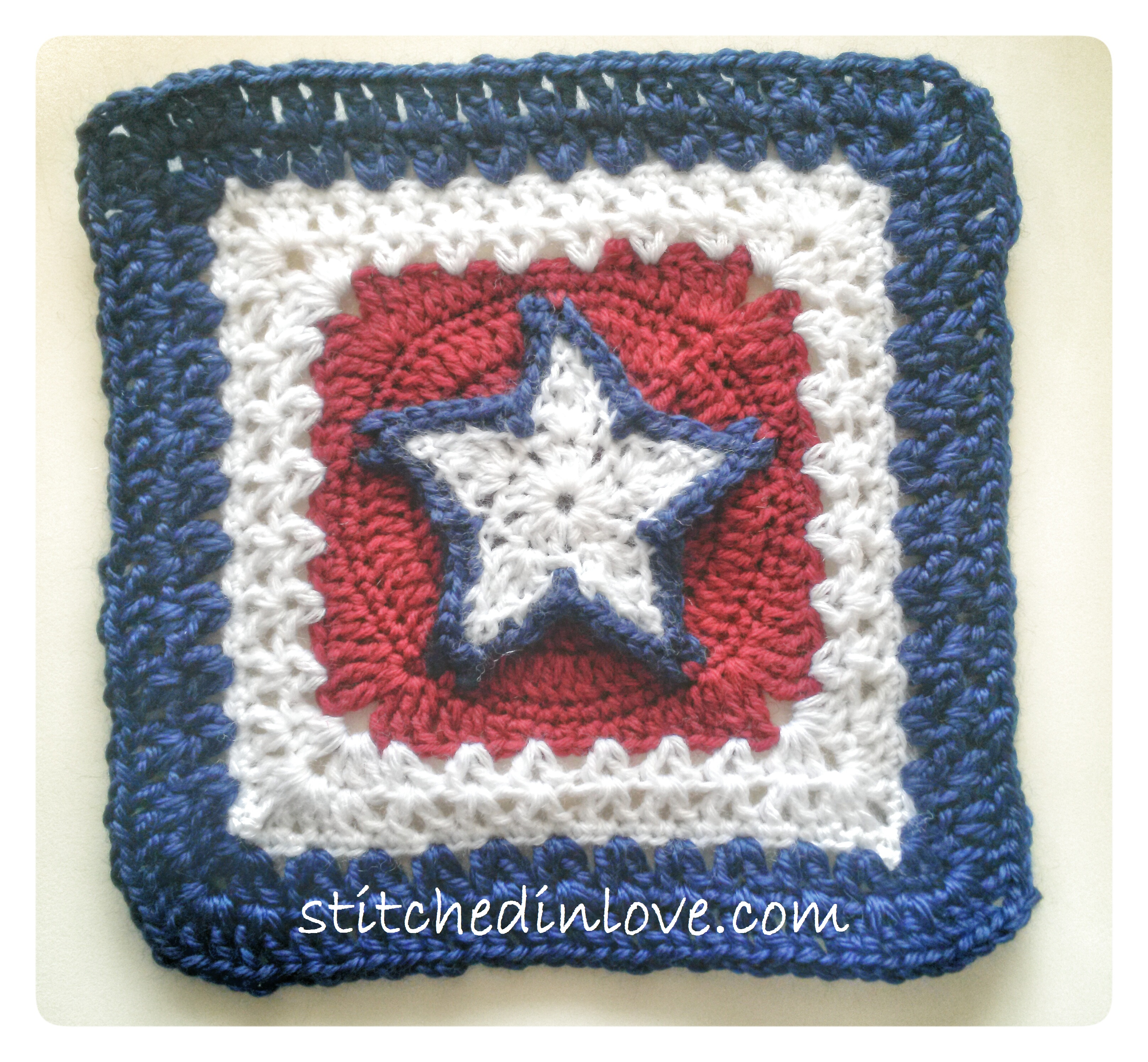 I think this is one of my favorite squares so far!  The pattern can be found here.  It made me think of fireworks and I just had to do it in red, white, and blue.  I love how it turned out.  Though if I did it again I’d probably just do the white either at the center or on the edging. It kind of breaks up the lines and makes their continuity hard to see.
