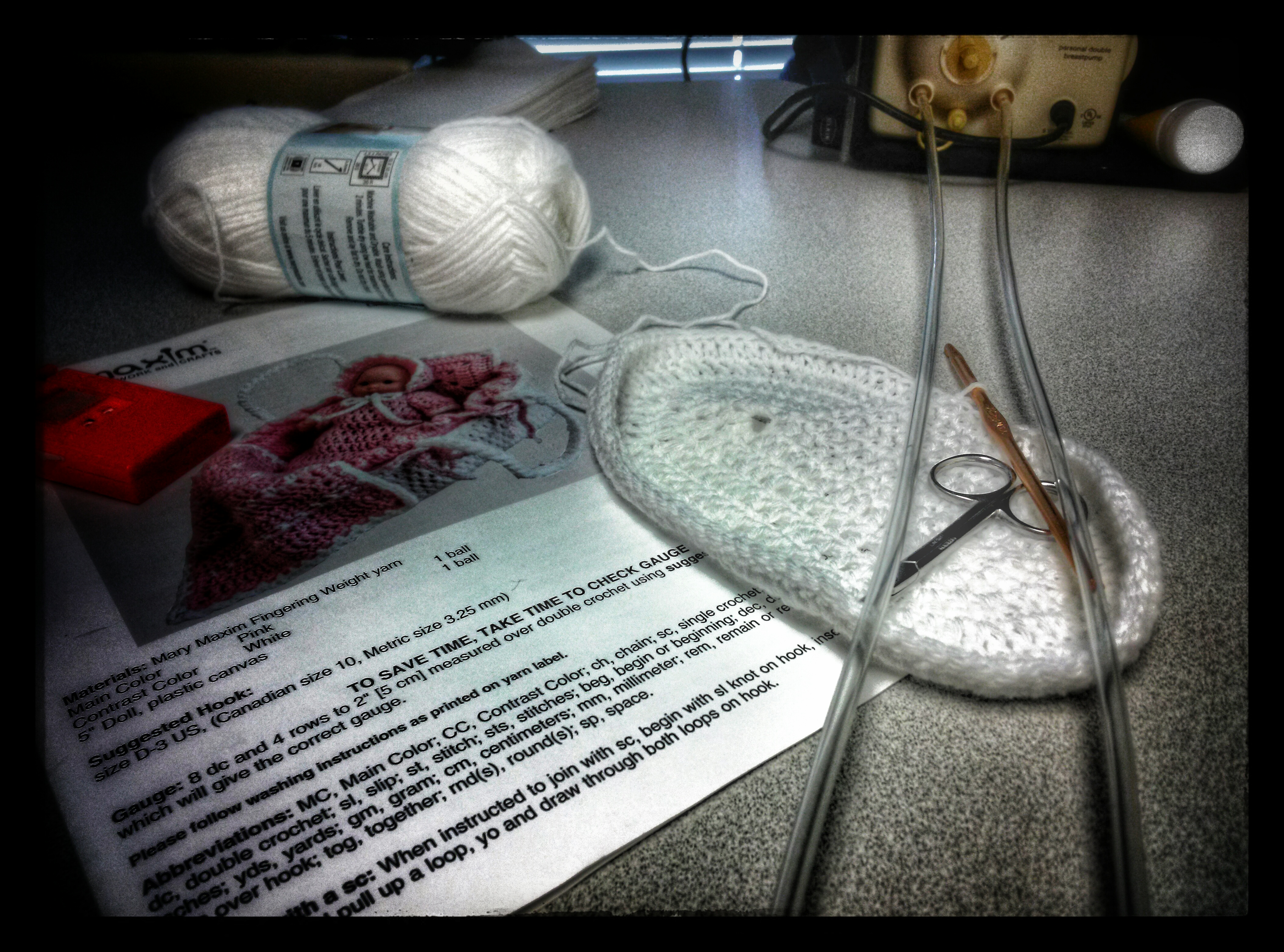 CrochetSo multi-tasking once again becomes the necessity.  More often than not I have to resort to crocheting during my lactation breaks at work.  (An infinitely better use of my time than the smoke breaks I used to take years ago.)  That’s right.  The milk I put into those bottles that go with G-man to daycare has to be expressed sometime.  So I pump at work for 20 minutes, 3 times a day.  I’m neither ashamed of nor embarrassed by this.  It’s liquid gold for the little guy-especially since he goes to daycare now.  The nutrients and antibodies he gets simply cannot be reproduced by formula and I am proud of the work I do to provide it when I can’t be with him.