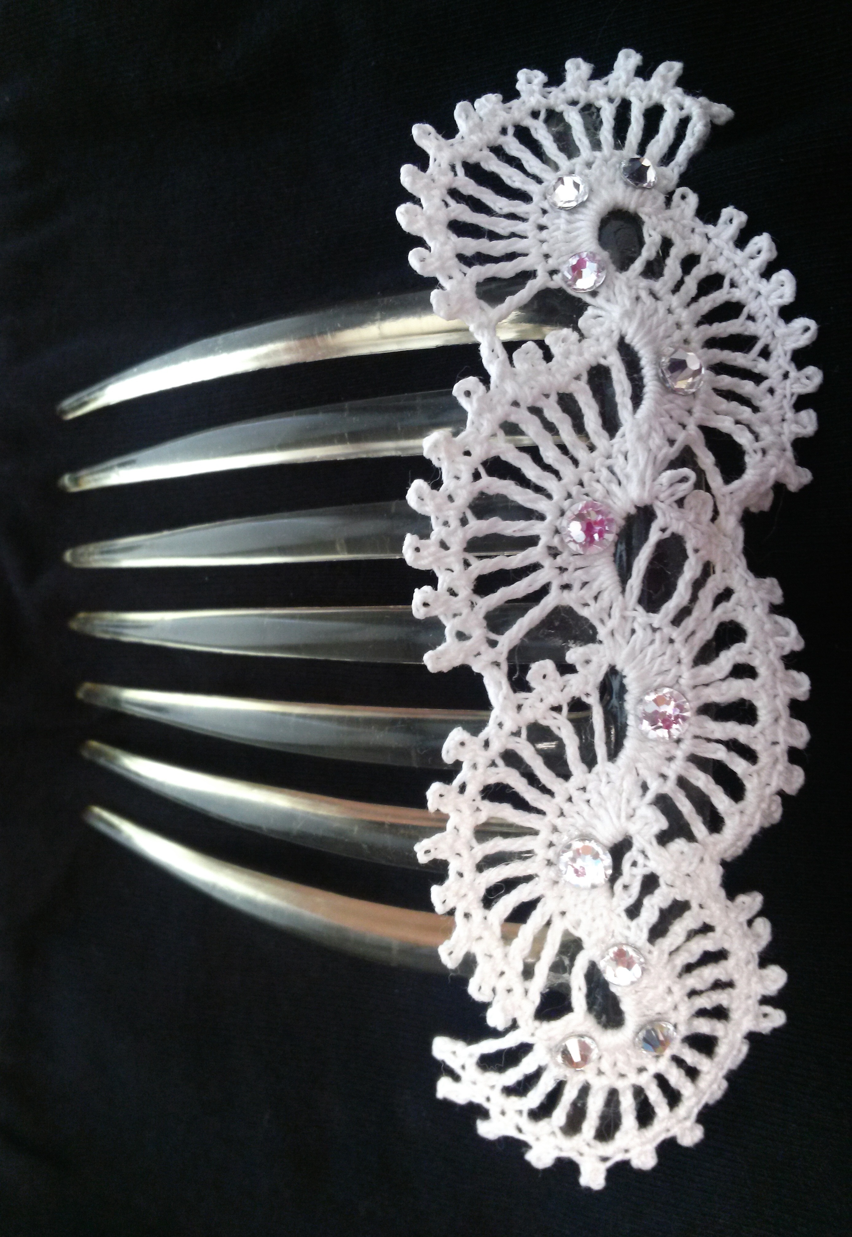 There are so many things that can be done to customize this.  I can use reclaimed, vintage thread from old doilies, bedspreads or table cloths.  I can also make it in new thread in dozens of different colors. It can be added to a clip or button loops instead of a comb. And embellishments are only limited by your imagination!